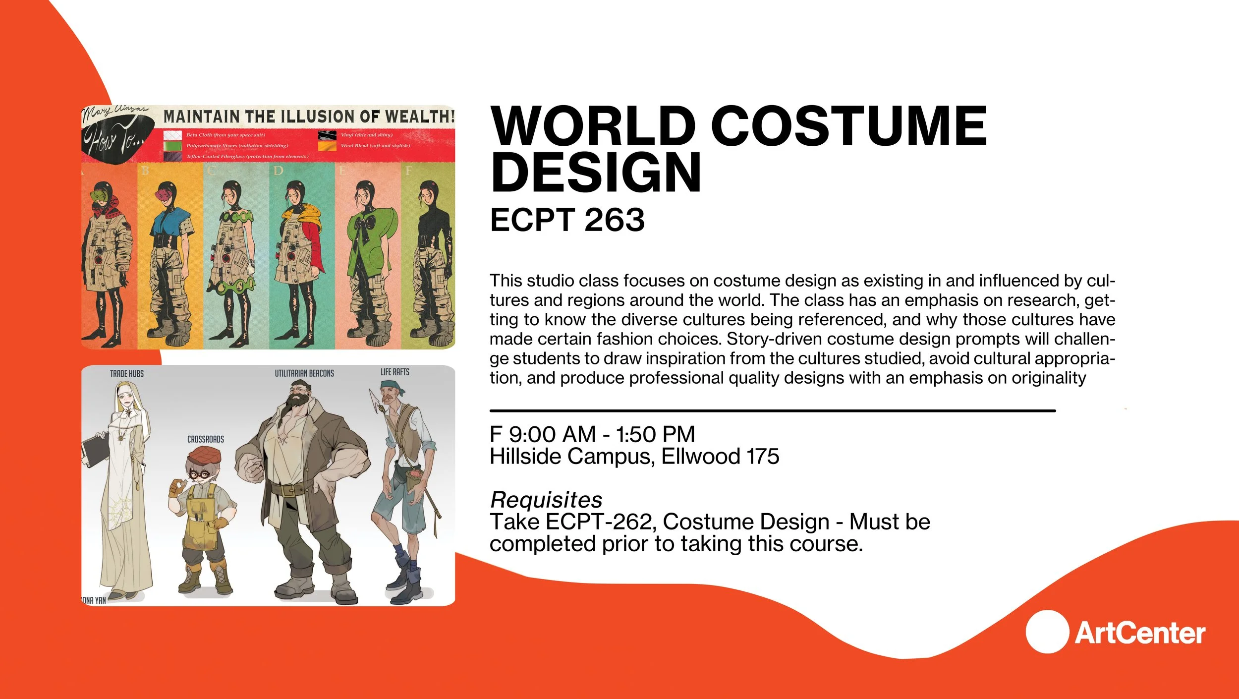 This studio class focuses on costume design as existing in and influenced by cultures and regions around the world. The class has an emphasis on research, getting to know the diverse cultures being referenced, and why those cultures have made certain fashion choices. Story-driven costume design prompts will challenge students to draw inspiration from the cultures studied, avoid cultural appropriation, and produce professional quality designs with an emphasis on originality.